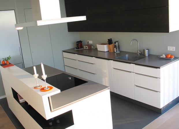 monument Material: weißer Lack, Räuchereichefurnier, Aluminiumgriffe, Arbeitsplatte Silestone, Tapete, grünes HPL, MDFOrt: Berlin-Schöneberg