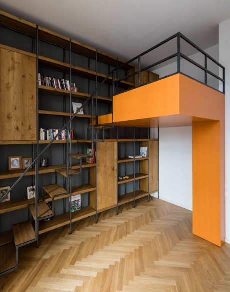 Im Wohnzimmer gibt es das Regal, an dem man hochsteigen kann und dort oben einen Schlafplatz findet.